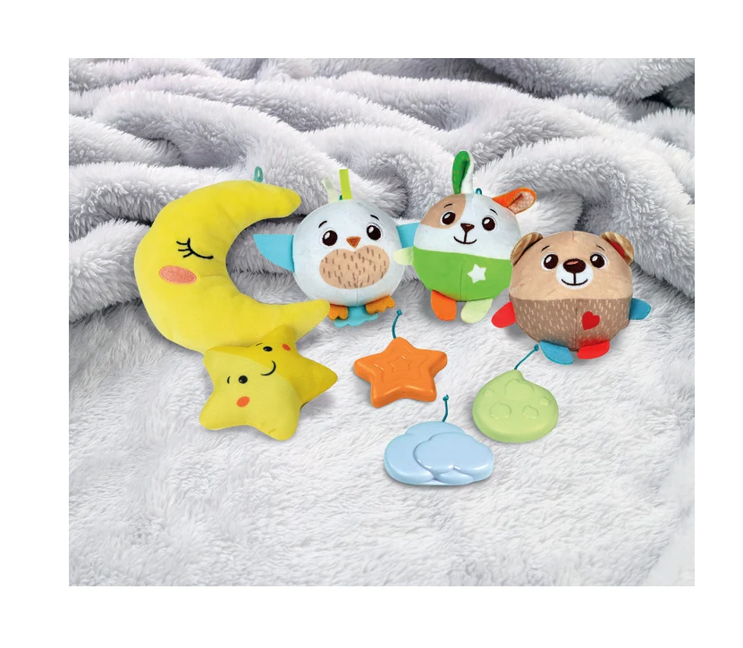 La lenta rotazione dei personaggi, in tessuto morbido, attira l’attenzione del bambino, favorendo lo sviluppo visivo e la coordinazione oculare.