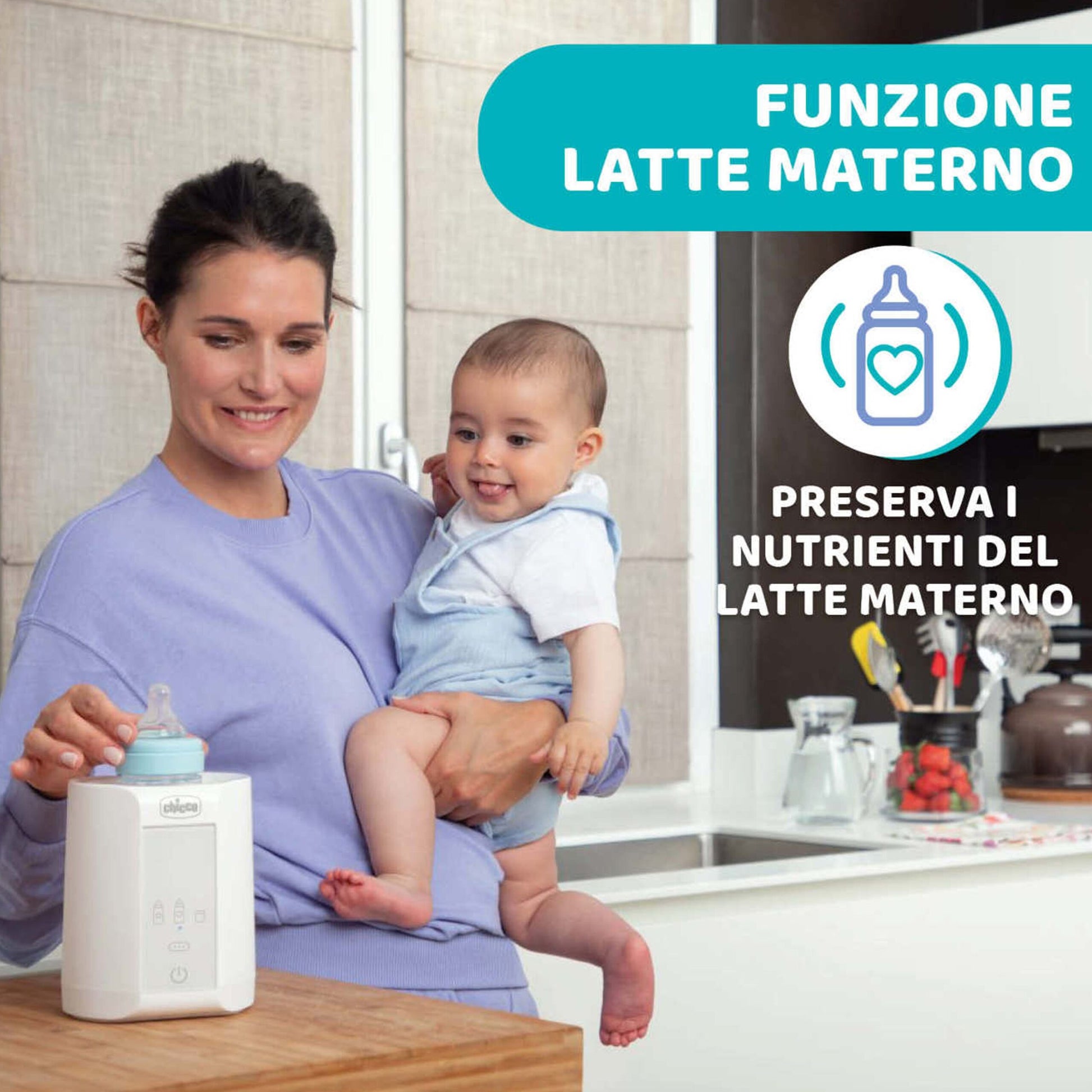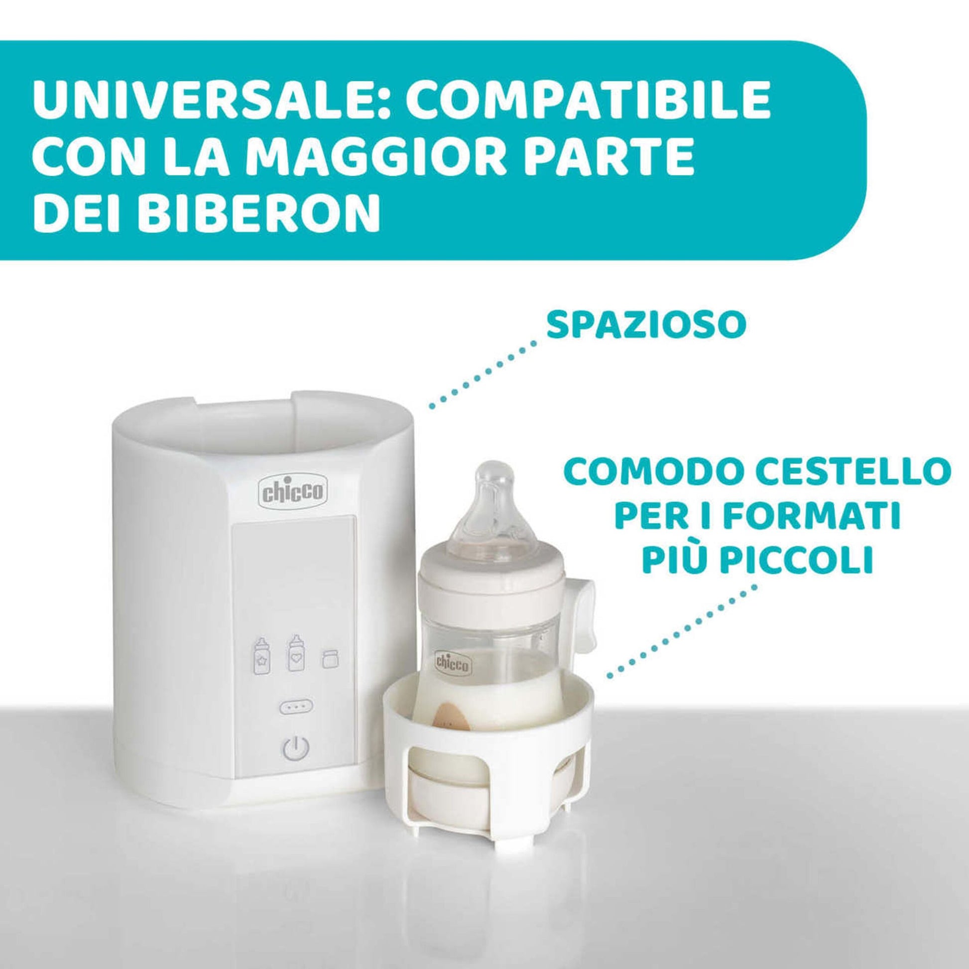 Mantiene la temperatura fino a 1 ora, con spegnimento e segnale acustico al termine del ciclo, per garantire sicurezza e praticità. Il cestello incluso facilita l’inserimento e la rimozione di biberon e vasetti, riducendo il rischio di scottature.
